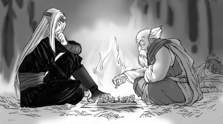 でかいですよ!サイズ適当に保存するんじゃなかった。 チェスとか将棋とかって名人になると何十手も先まで読んだりするそうですけど この2人の勝負はむちゃくちゃ長期戦(互いに長考)になりそうだなあ。という感じの絵。 取った駒描くの忘れた…駒の色分けるの忘れたー!あああ(迂闊すぎ)