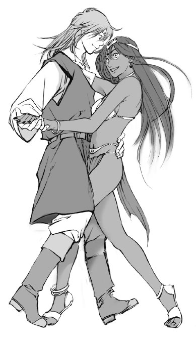ミチヲさんからのリクエスト 「マーニャ(FC版もしくは久美小説版)と 勇者の大人な雰囲気のイラスト」 です。 どこがだー!というツッコミが全方位から来そうです…。 ご期待に添えてなかったら申し訳ありません。 大人な雰囲気っていうと、手を握って見つめあって… という相変わらず貧相な想像をしていたんですが、 せっかく踊り娘さん相手なわけだし! どうせなら踊ってもらおうかと。 田舎者の勇者君は当然ダンスなんて出来るはずもなく、 旅の合間にマーニャ姐さんが(暇潰しで)教え続けて おかげさまで随分上手になりました、という感じ。 いちおう勇者君がリードしてます(笑) ミチヲさん、リクエストありがとうございました! |